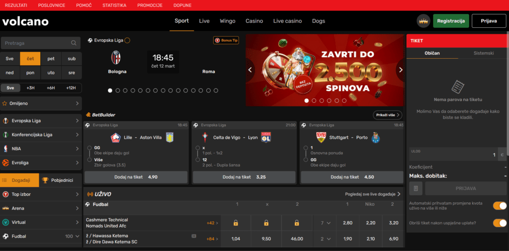 VolcanoBet takođe nudi različite bonuse i promotivne akcije, uključujući bonus na prvi depozit i povremene besplatne opklade, dok kazino sekcija sadrži veliki izbor slotova i live kazino igara.